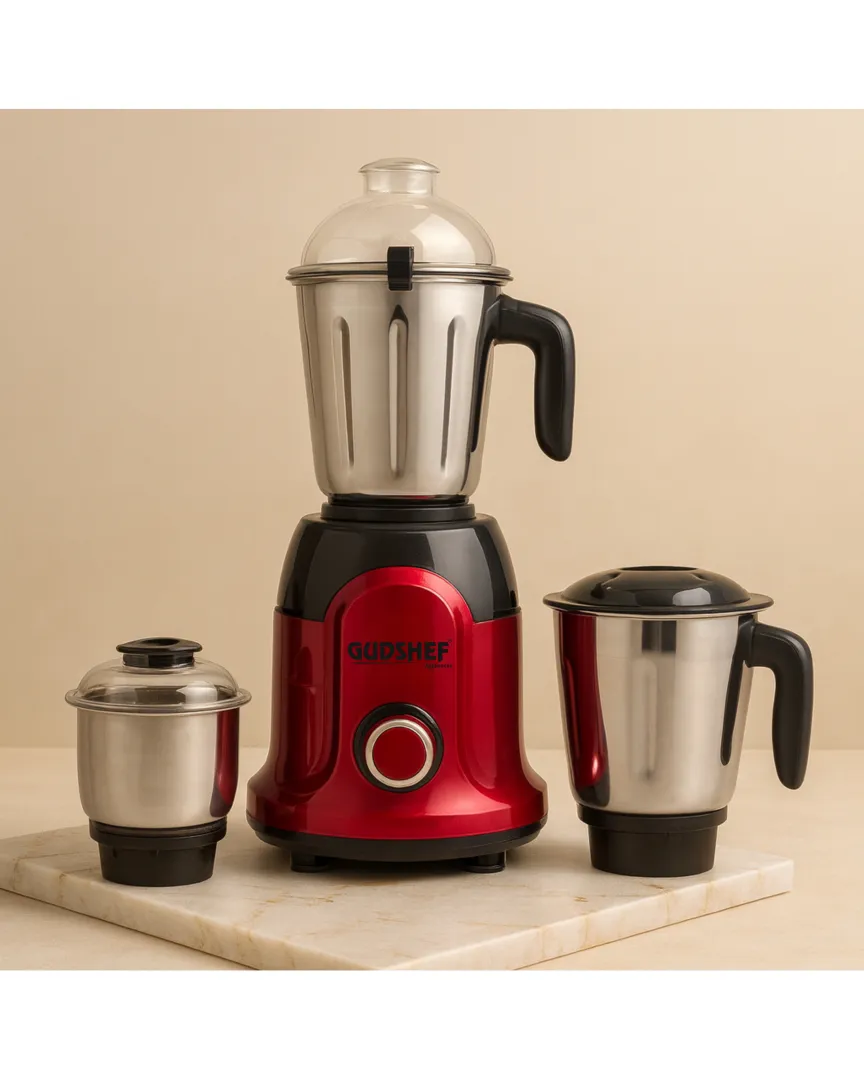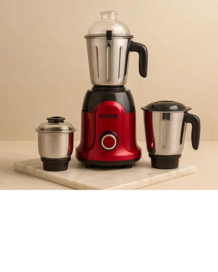 The GUDSHEF Ultra 3-Jar Mixer Grinder (750W) is designed for powerful and efficient kitchen performance. Equipped with a 750-watt high-performance motor, it delivers smooth grinding, blending, and mixing for everyday and heavy-duty cooking needs. The three multi-purpose jars are ideal for wet grinding, dry grinding, and chutney preparation. Built with durable materials and sharp stainless-steel blades, this mixer grinder ensures consistent results and long-lasting reliability. Backed by a 3-year warranty, the GUDSHEF Ultra mixer grinder is a dependable choice for modern kitchens.